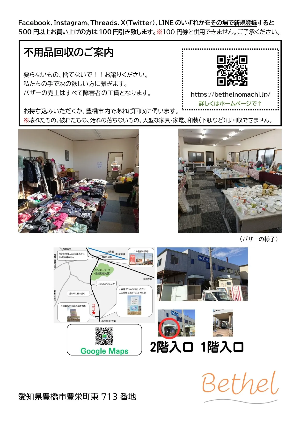特定非営利活動法人ベーテルの街では、事業所内で毎月第4土曜日にバザーを開催しています。